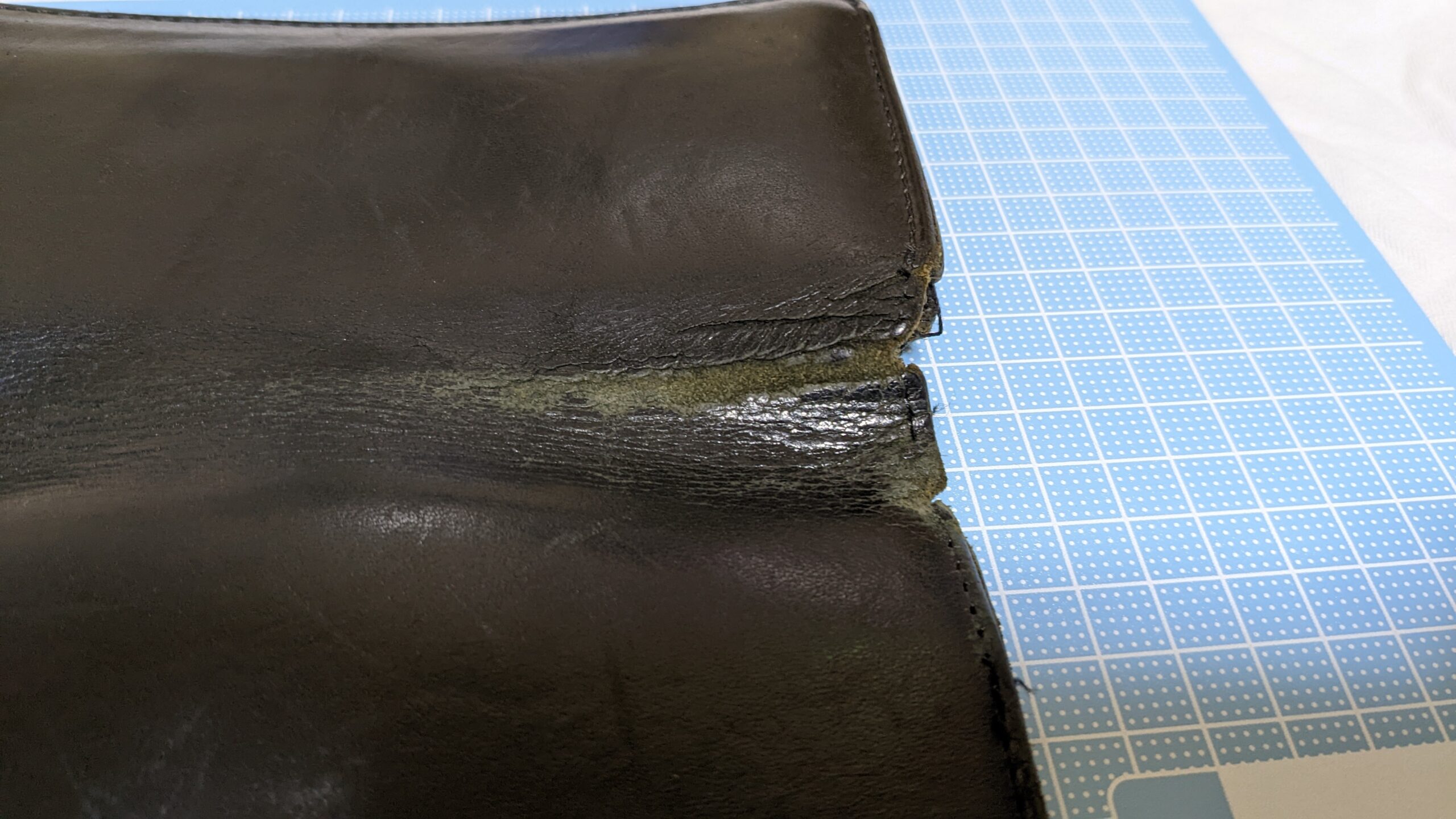 革が剥がれているだけでなく縁が切れている。この両サイドをメインにパッチを当てて補強してやろうかと模索中。